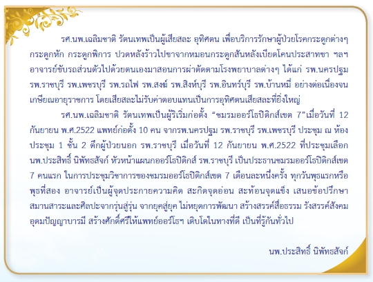 ท่านเป็นแพทย์ออร์โธปิดิกส์กลุ่มแรกๆ ที่รวมตัวกันตั้งเป็นชมรมออร์โธปิดิคส์แห่งประเทศไทย โดยท่านได้รับหน้าที่เป็นเหรัญญิกคนแรกของชมรมฯ ต่อมาภายหลังเมื่อได้มาตั้งเป็นสมาคมออร์โธปิดิคส์และราชวิทยาลัยแพทย์ออร์โธปิดิกส์แห่งประเทศไทยตามลำดับ ท่านยังมาร่วมประชุมกับแพทย์ออร์โธปิดิกส์รุ่นน้อง รุ่นลูกอย่างสม่ำเสมอ เป็นที่น่าเสียใจที่ท่านมาประสบอุบัติเหตุทางรถยนต์ที่จังหวัดชลบุรีในปี พ.ศ. 2523 ต่อมาท่านป่วยเป็น stroke เป็นอัมพาตและเสียชีวิตในปี พ.ศ. 2558