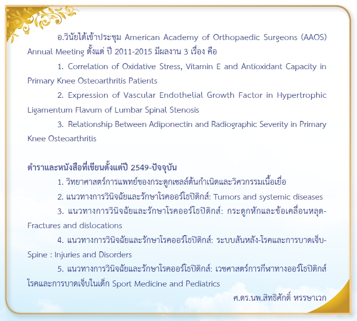ในการเดินทางไปฝึกอบรมในครั้งนั้น ท่านได้มีโอกาสเรียนกับ Professor หลายท่าน เช่น ProfessorKarl Chiari, Professor J. Bohler และ Professor Ender เมื่อท่านได้รับ Diploma in Orthopaedics andTraumatology (Vienna) ได้เดินทางกลับมาทำงาน ณ คณะแพทยศาสตร์ จุฬาลงกรณ์มหาวิทยาลัย พร้อมกับได้จัดหาเครื่องมือผ่าตัดบางอย่างติดมือกลับมาด้วย เมื่อ พ.ศ.2516