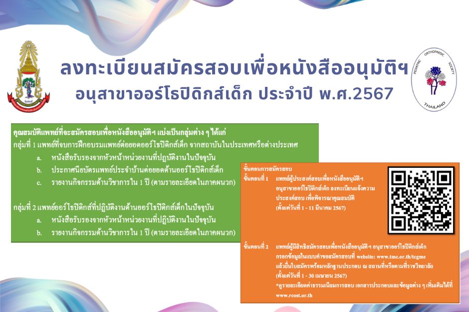ลงทะเบียนสมัครสอบเพื่อหนังสืออนุมัติฯ อนุสาขาออร์โธปิดิกส์เด็ก ประจำปีพ.ศ. 2566